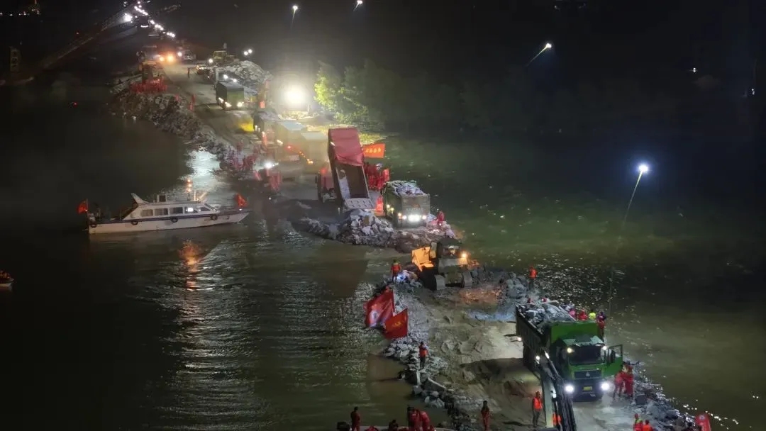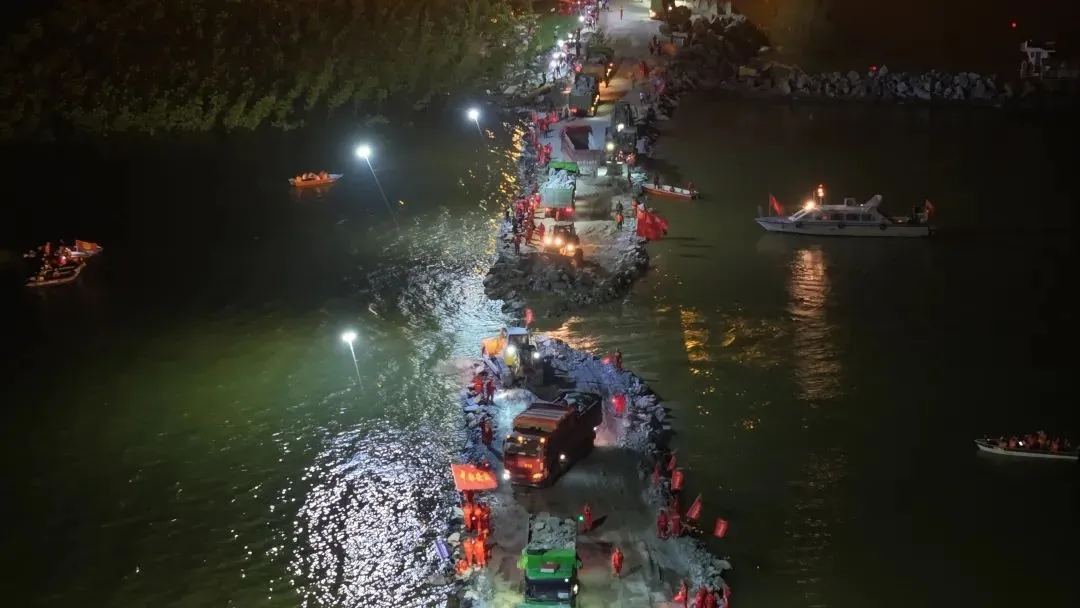 “為了加快進度,從6日晚上起,我們增加水上拋投作業,采用大型駁船運輸大塊石,并在船上布置皮帶輸送機、駁船底開口進行拋投石料,平堵戧堤。”中國安能技術專家張軒莊說。整個夜晚,工程車輛的大燈、運輸物料的卡車尾燈、大功率應急照明燈點亮了長長的大堤。