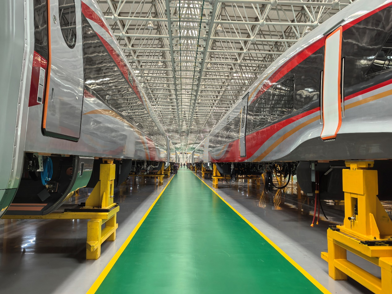 高鐵生產(chǎn)按照工藝布局分為“車體、涂裝、裝配、調(diào)試”四個(gè)主要單元,大家熟知的“和諧號(hào)”“復(fù)興號(hào)”都是在這里裝配完成,奔馳在祖國大地。這條裝配產(chǎn)線具備月產(chǎn)14列動(dòng)車組的生產(chǎn)能力。
