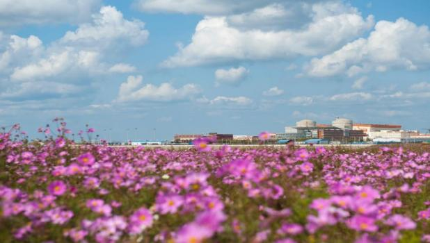 每年夏季,紅沿河核電基地內(nèi)的波斯菊、薰衣草盛開,形成一片面積超10萬平方米的格桑花海。
