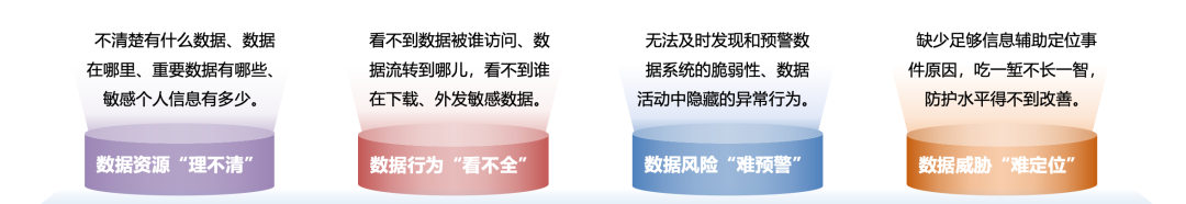 數據是新時代重要的生產要素,央國企、政務機構中有許多數據規模已達到TB級。然而,隨著數據規模的極速增長,數據管理上面臨著資源理不清、行為看不全、風險難預警、威脅難定位等問題。