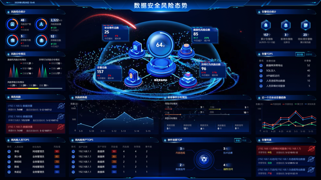 以某大型企業對“流衡”的實際應用為例,數據資產全面梳理過程中,將超過500個數據庫實例、6000+API接口納入管控,重點、熱點、暗數據一目了然。借助“流衡”,企業建立起識別內置勒索攻擊、數據異常傳輸出境、離職員工異常外發等60多類事件的模型。