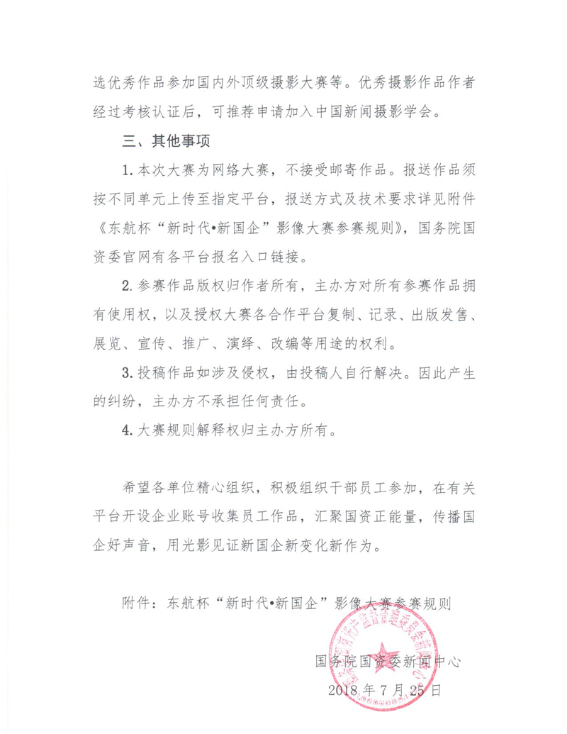 1.本次大賽為網絡大賽,不接受郵寄作品。報送作品須按不同單元上傳至指定平臺,報送方式及技術要求詳見附件《東航杯“新時代?新國企”影像大賽參賽規則》,國務院國資委官網有各平臺報名入口鏈接。