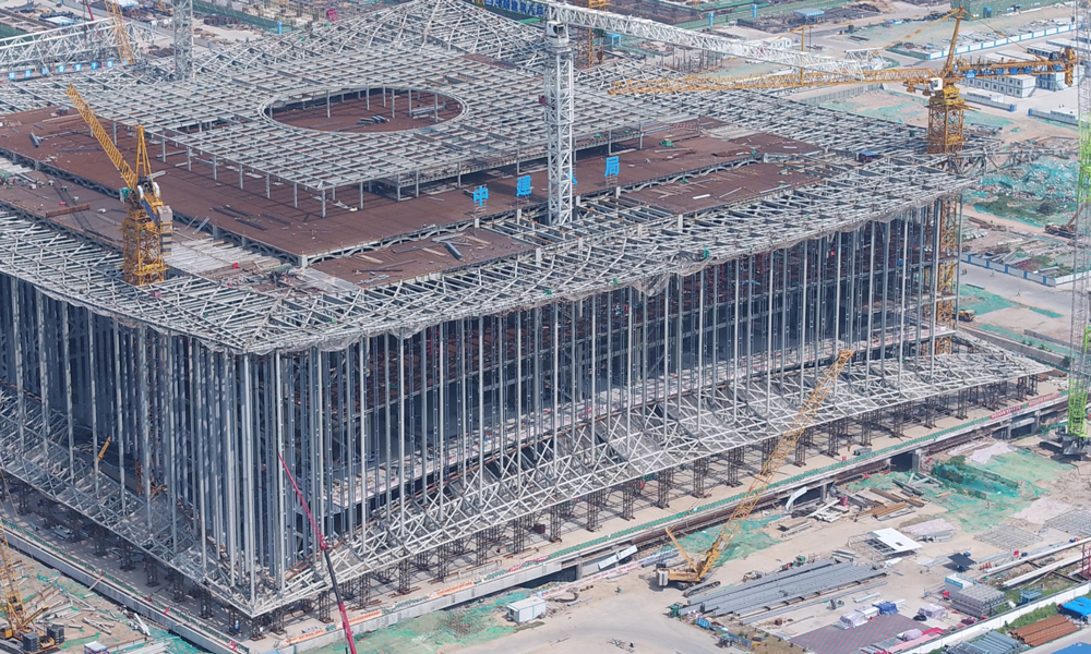 西安絲路國際會議中心工程項目幕墻高度58.80米,幕墻面積約20萬平方米,分為FS1大跨度組合鋼吊柱玻璃幕墻、FS2底層坐式全玻幕墻、FS3上下月牙金屬幕墻(基層為直立鎖邊屋面),幕墻造型復雜,且成弧線布置。圖為項目施工現場。