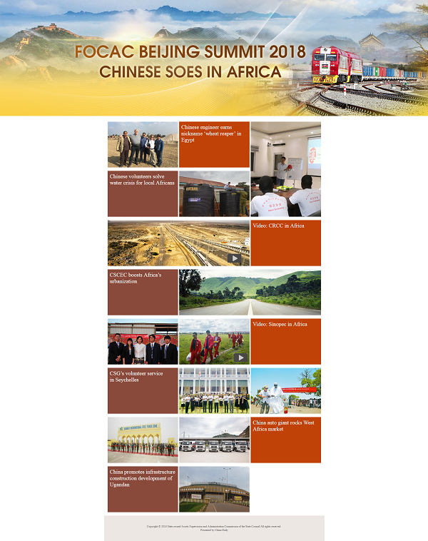 2018年中非合作論壇北京峰會于9月3日在人民大會堂隆重開幕。為契合峰會的“合作共贏,攜手構建更加緊密的中非命運共同體”主題,更好地展現中非企業合作與交流的成就,講好中央企業在非洲的故事。9月4日,國資委網站英文版和海外社交媒體平臺共同推出了“中非合作論壇 - 央企在非洲”【FACOC Beijing Summit 2018-Chinese SOEs in Africa】專題報道。