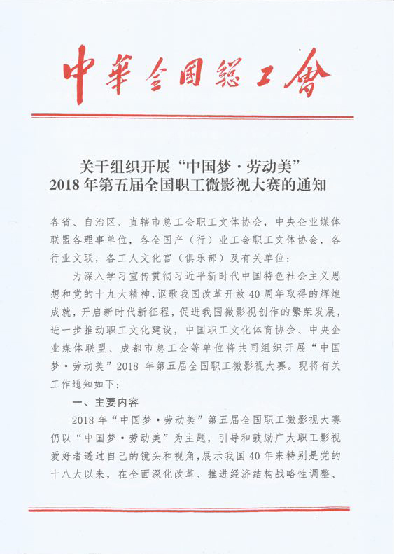 為深入學(xué)習(xí)貫徹習(xí)近平新時代中國特色社會主義思想和黨的十九大精神,謳歌我國改革開放40周年取得的輝煌成就,開啟新時代新征程,促進中國微影視創(chuàng)作的繁榮發(fā)展,進一步推動職工文化建設(shè),中國職工文化體育協(xié)會、中央企業(yè)媒體聯(lián)盟、成都市總工會等單位將共同組織開展“中國夢·勞動美”2018年第五屆全國職工微影視大賽?,F(xiàn)將有關(guān)工作通知如下: