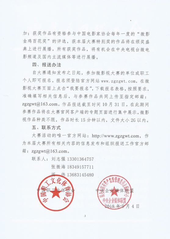 自大賽通知發(fā)布之日起,參加微影視大賽的單位或職工個人即可報名。報名須登陸官方網(wǎng)站www.zgzgwt.com,在微影視大賽頁面上點擊“我要報名”,下載報名表格,按照要求,準確填寫相關(guān)信息后,與參賽作品共同上傳至指定郵箱:zgzgwt@163.com。作品報送截至?xí)r間10月31日。在此期間參賽作品將在大賽官網(wǎng)客戶端的專題頁面進行集中展示。微影視作品種類不限,作品時長15分鐘以內(nèi),文件大小2G以內(nèi)。