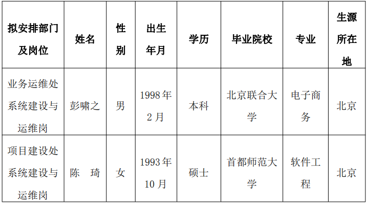 根據事業單位公開招聘人員有關規定,國資委信息中心先后完成公開報名、資格審核、考試、體檢、考察等程序,經研究,擬聘用以下2020年應屆畢業生為我中心工作人員,現予公示。