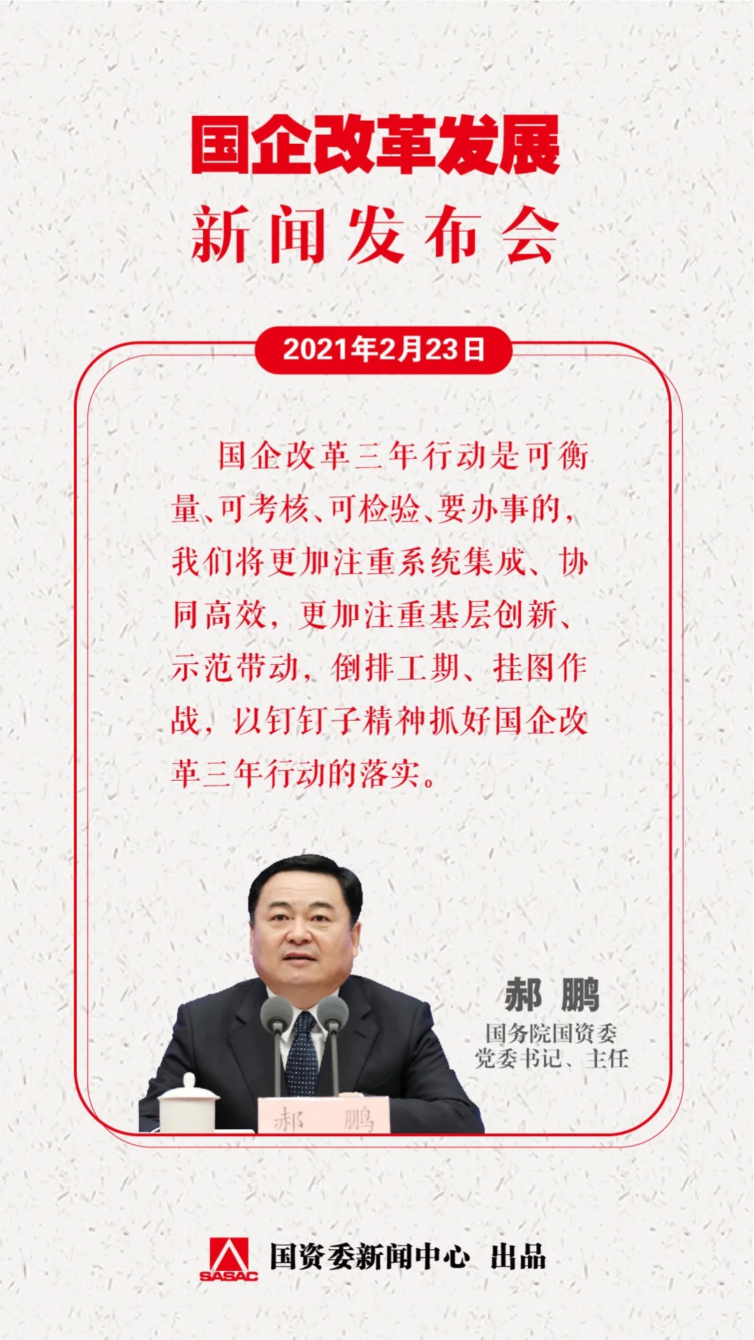 2月23日,國務(wù)院國資委黨委書記、主任郝鵬應(yīng)邀出席國務(wù)院新聞辦舉行的新聞發(fā)布會,介紹國資國企發(fā)展改革監(jiān)管和黨的建設(shè)工作情況,并就如何深化國企改革、加大科技創(chuàng)新、完善國資監(jiān)管體制、參與共建“一帶一路”、推進(jìn)重組整合、防范化解金融風(fēng)險等,回答了中外媒體記者提問。國務(wù)院國資委秘書長、新聞發(fā)言人彭華崗參加新聞發(fā)布會,并回答了有關(guān)問題。