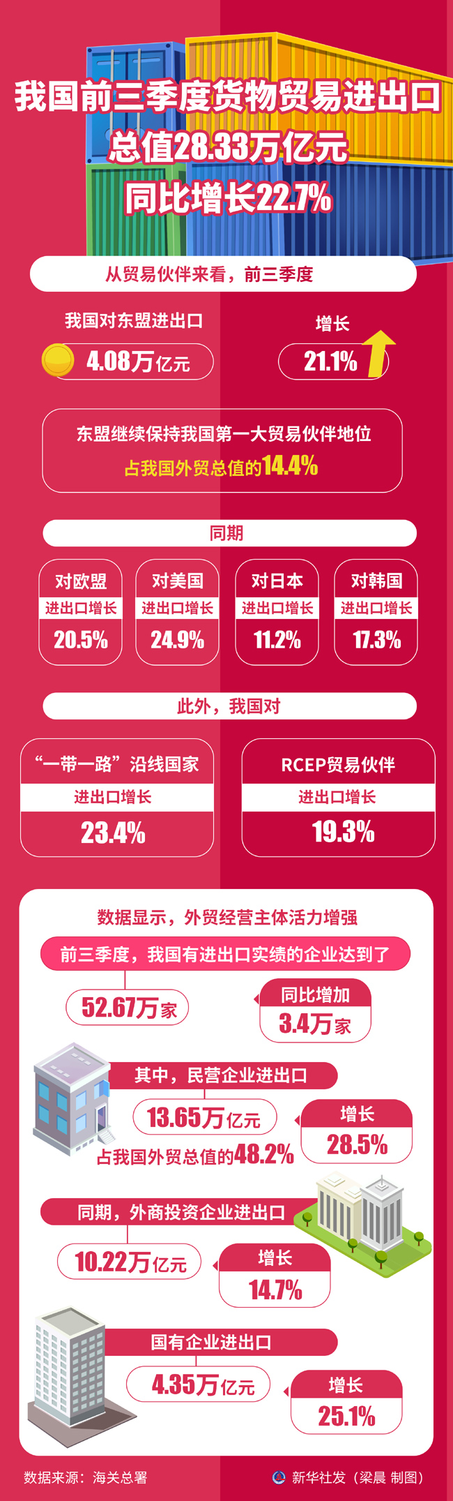 圖表:我國前三季度貨物貿易進出口總值28.33萬億元,同比增長22.7%