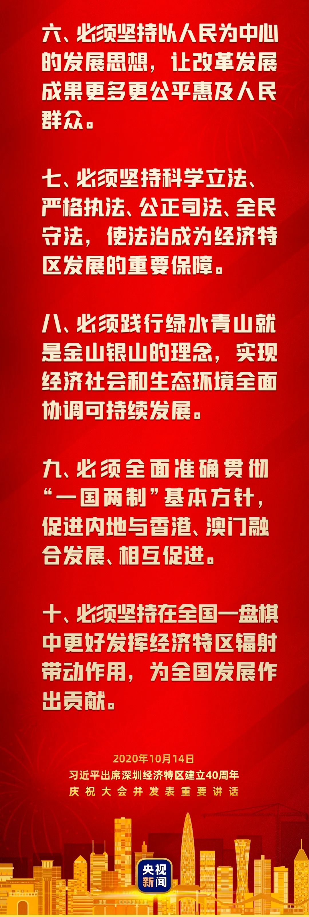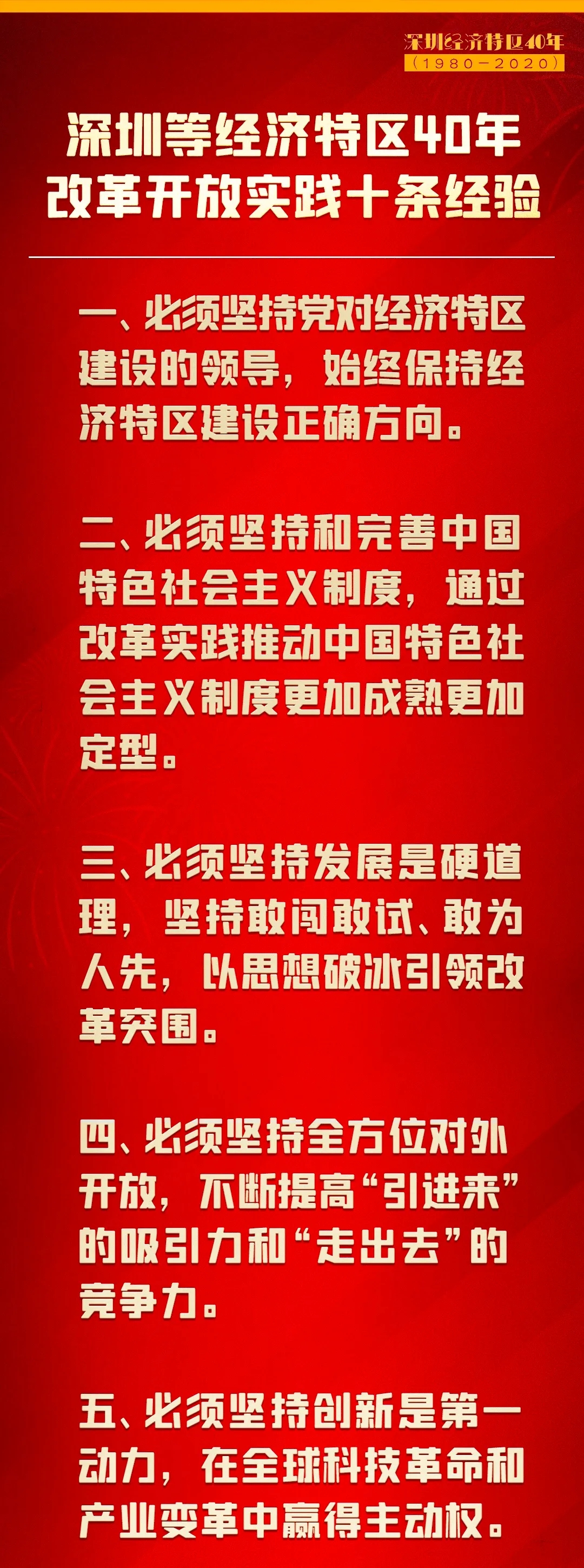 習近平強調,以上十條,是經濟特區40年改革開放、創新發展積累的寶貴經驗,對新時代經濟特區建設具有重要指導意義,必須倍加珍惜、長期堅持,在實踐中不斷豐富和發展。