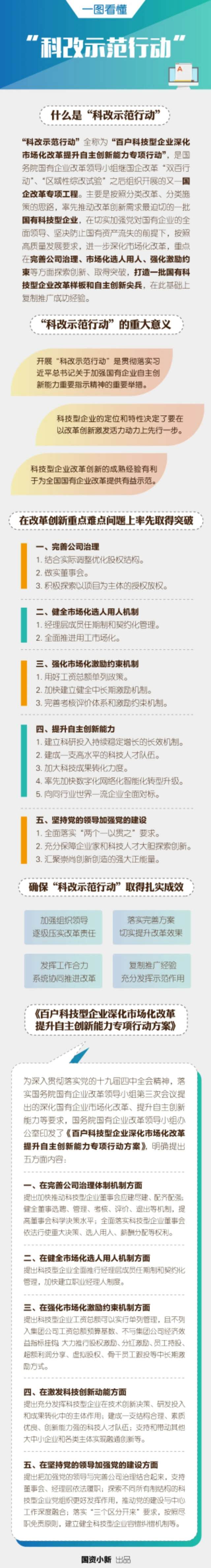 “科改示范行動”是繼國企改革“雙百行動”、“區域性綜改試驗”后的又一國企改革專項工程,共選取了200余戶改革創新緊迫性較強的國有科技型企業,在切實加強黨對國有企業的全面領導、堅決防止國有資產流失的前提下,按照高質量發展要求,進一步推動深化市場化改革,重點在完善公司治理、市場化選人用人、強化激勵約束等方面探索創新、取得突破,打造一批國有科技型企業改革樣板和自主創新尖兵,在此基礎上復制推廣成功經驗。
