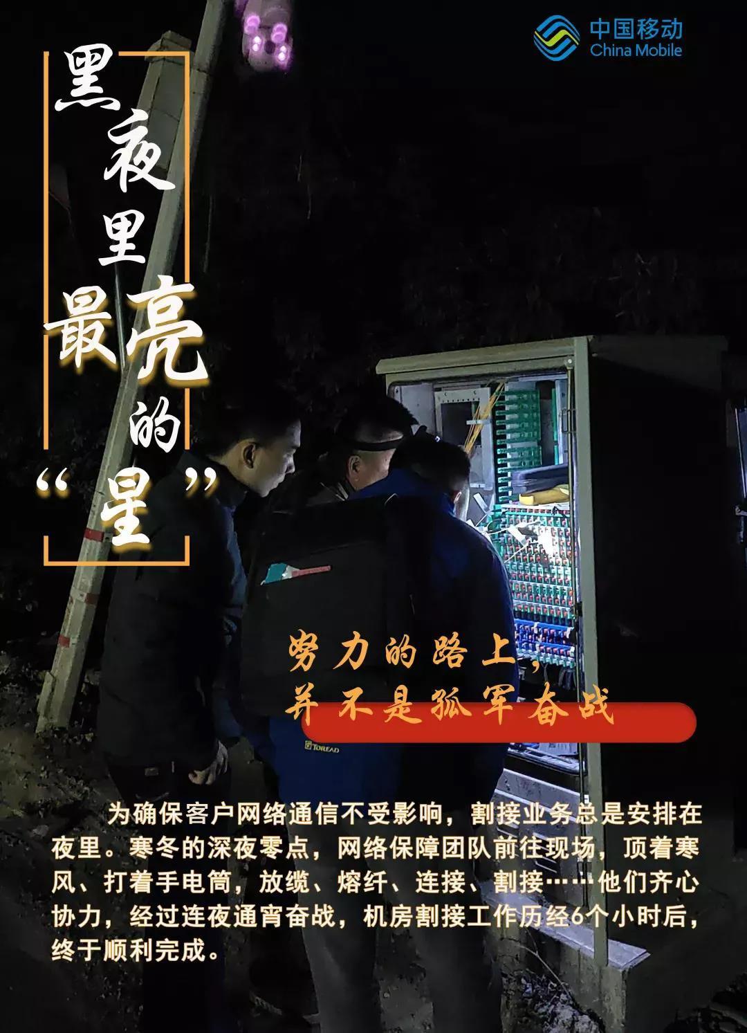 星光不負(fù)趕路人,歲月不負(fù)有心人,無數(shù)個黑夜里的努力,凝聚著移動人對通信事業(yè)的熱愛與責(zé)任,肩負(fù)通信使命,奮斗在路上!