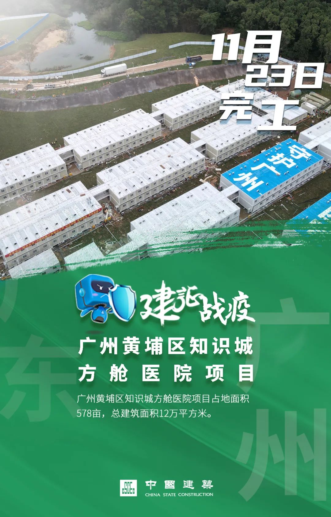 11月23日,中建三局、中建四局、中建裝飾建設的廣州黃埔區知識城方艙醫院項目完工。該項目總建設用地578畝,總建筑面積12萬平方米,由污染區、半污染區、清潔區三大區域組成,包括醫護區、隔離病區、清洗場地及相關配套用房,共設置9192個床位。