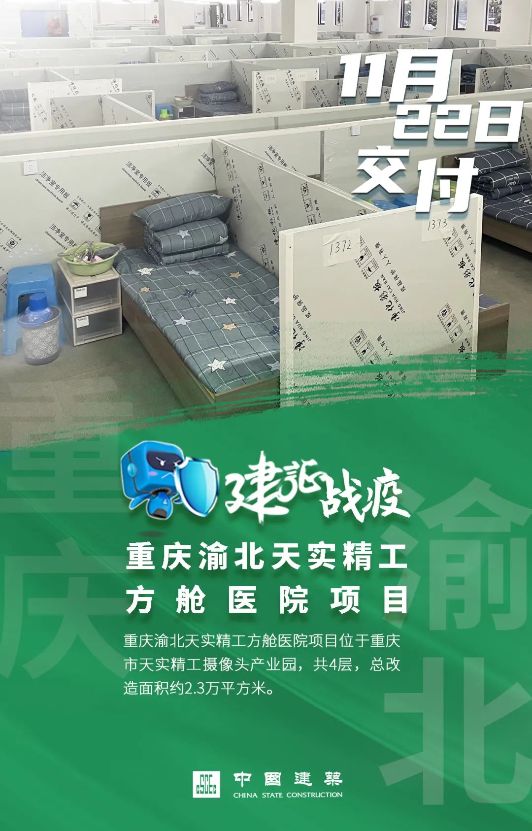 11月24日,中建科技承建的重慶市長壽區小巖方艙醫院項目完工。項目占地面積約2.07萬平方米,總建筑面積約2.3萬平方米,由標準的工業廠房改建而成,可提供1506張床位。