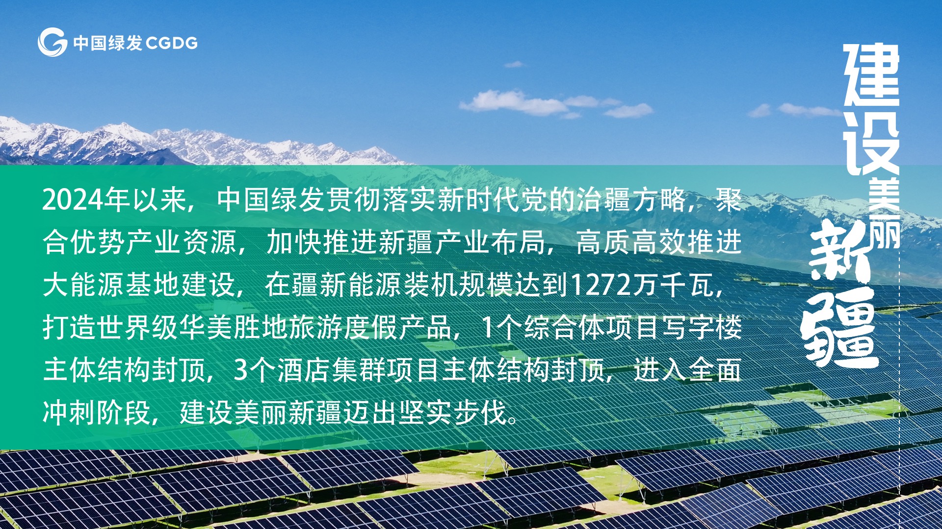 2024年以來,中國綠發聚合優勢產業資源,加快推進新疆產業布局,高質高效推進大能源基地建設,在疆新能源裝機規模達到1272萬千瓦,打造世界級華美勝地旅游度假產品,1個綜合體項目寫字樓主體結構封頂,3個酒店集群項目主體結構封頂,進入全面沖刺階段,建設美麗新疆邁出堅實步伐。