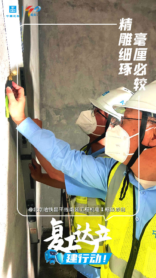 在北京地鐵昌平線南延工程機電Ⅰ標段項目,中建安裝建設(shè)者正在測量二次結(jié)構(gòu)墻面抹灰平整度。