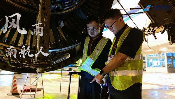 在貴陽機場,南航集團機務人員冒雨進行孔探檢查,保障飛機安全平穩運行。