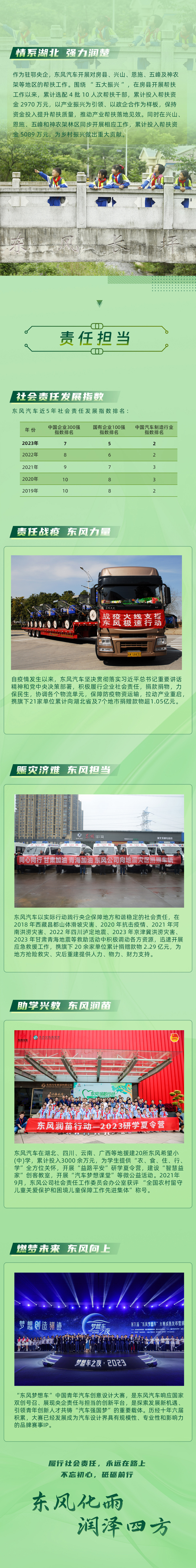 今年是東風公司發布社會責任“潤”計劃12周年。2012年,東風公司率先發布中央企業首份社會責任中期行動計劃——“潤”計劃,加強對社會責任工作的戰略引領。12年來,秉承“東風化雨、潤澤四方”的履責理念,踐行“誠信、創新、賦能、致善”的責任價值觀,東風公司在抗災救災、脫貧攻堅、鄉村振興、社會公益等方面全力作為,積極為社會可持續發展貢獻力量。