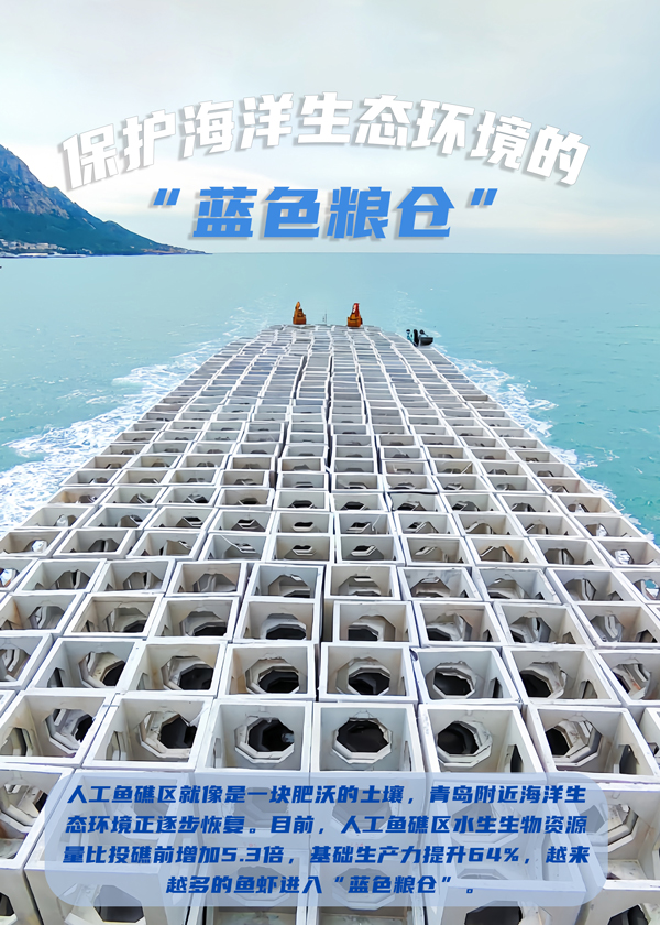 由中交集團下屬一航局承建的國信海洋牧場人工魚礁一、二期工程,位于山東省青島田橫島東南部海域。項目建設過程中,累計向海底投放魚礁體6.7萬空心方樁,共計8375個,形成10個單位人工海底魚礁群。項目的完工,不僅為海域內海洋生物提供了良好的繁殖、生長、棲息環境,也為海參和魚類漁場提供優異的養殖、庇護場所,將漁業與受損海洋生態系統修復巧妙結合,助力可持續發展。
