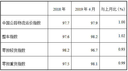 表1 2019年4月中國公路物流運價指數表