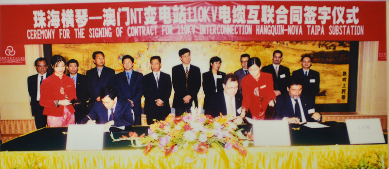 2002年11月18日,珠海電力建設工程有限公司代表與澳門電力公司代表在簽訂“珠海橫琴-澳門NT變電站110kV電纜互聯合同時的情景。陳俊書 攝