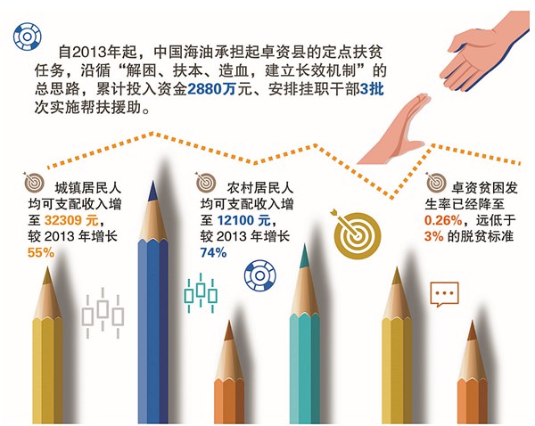 3月4日,經內蒙古自治區人民政府批準,中國海油對口幫扶地內蒙古卓資縣正式退出貧困縣序列。至此,中國海油對口幫扶的6個縣市全部脫貧摘帽。