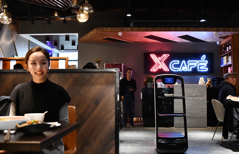 在中新天津生態城“X未來餐廳”,自動駕駛機器人給顧客上菜(2018年11月10日攝)。
