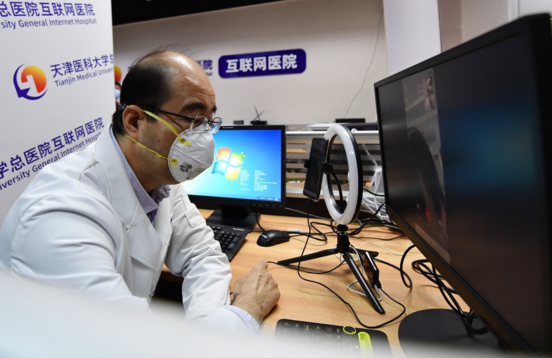 在天津醫科大學總醫院互聯網醫院,醫生用手機視頻進行線上問診(3月3日攝)。
