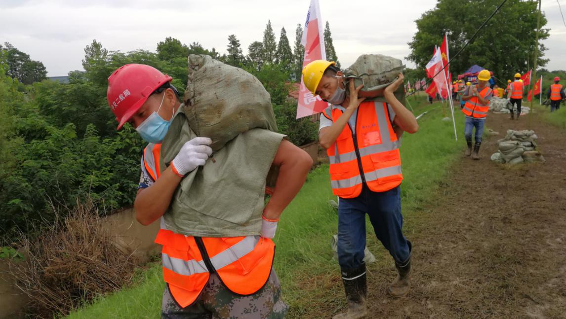 2號點的河堤旁邊,80名民兵隊員和168名防汛突擊隊員,分成24列從堤壩底端排列至堤上,接龍傳遞沙袋,以此碼至堤沿邊,鑄成一條白色的沙袋防護(hù)帶。一陣暴雨襲來,打在安全帽上轟隆直響,打得旗幟哐啷紛飛。“繼續(xù)發(fā)揚‘火眼’抗疫精神,全力以赴保衛(wèi)朱家河!”在2號點,曾任“火眼”實驗室現(xiàn)場負(fù)責(zé)人劉宜全,此時成為了現(xiàn)場搶險總指揮,帶著200多名二航局職工俯下身子,奮力搶險。