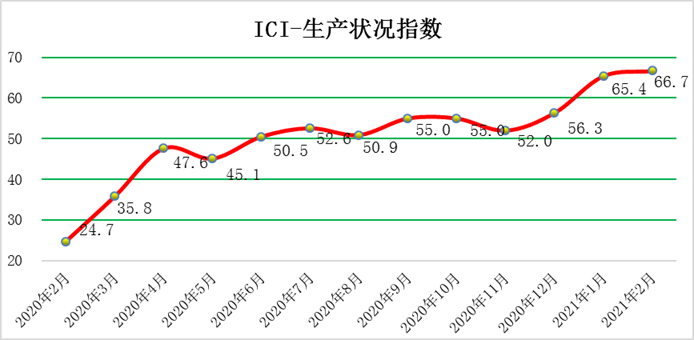 2月份,生產狀況指數為66.7 %,環比上漲1.3個百分點,小幅上漲,連續處于高位,總體看,工業生產情況良好,生產活動持續恢復。具體來看:產量指數為67.9%,環比上漲1.1個百分點,生產活動持續活躍;銷量指數為69.5%,環比上漲0.7個百分點,繼續位于榮枯線之上,新訂單指數上漲,國內需求持續增加,銷量增速穩定。出廠價格指數為57.4%,環比上漲1.4個百分點,工業品總產值上漲,與此相應,企業出廠價格指數上漲。主營業務收入指數為66.8%,環比上漲0.6個百分點,企業出廠價格和銷量同時上漲,企業的主營業務同比收入相對上升;設備利用率指數為62.9%,環比上漲0.9個百分點,企業產能持續恢復,出貨持續順暢。