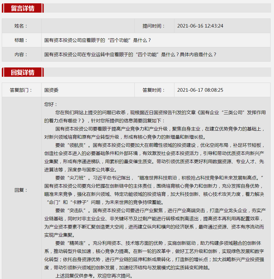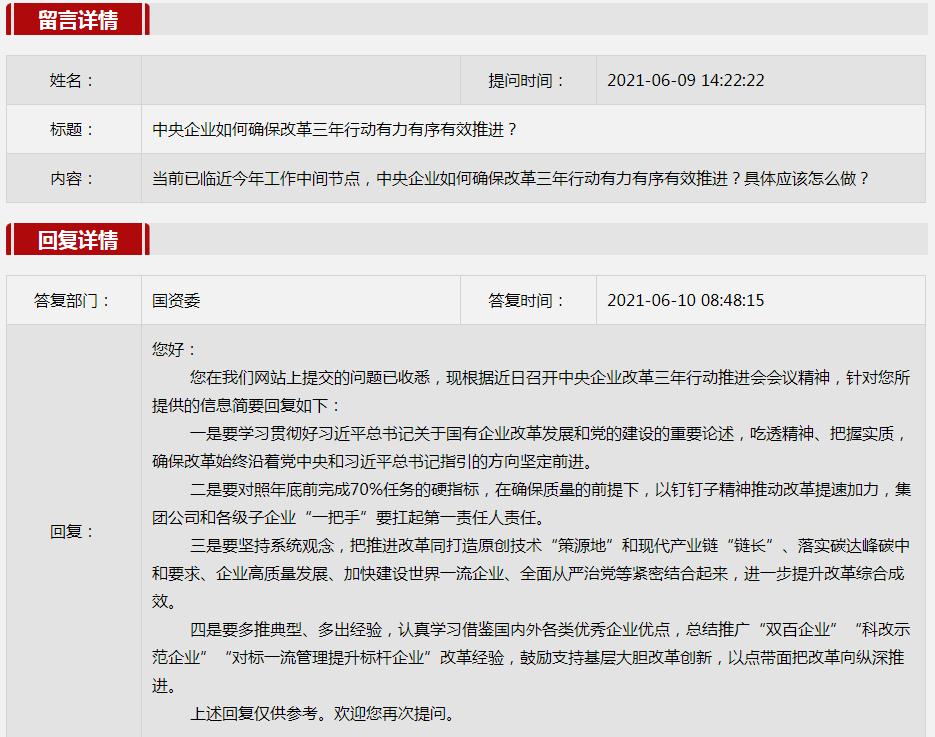 2021年6月國資委網站政務咨詢欄目部分網友提出的咨詢,我們初步做出了認真的回應,現選擇五條關注度高、點擊量高的問題,再次推薦分享。