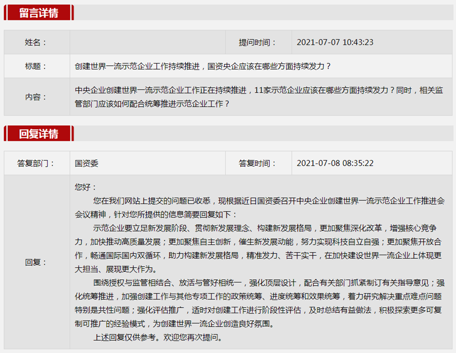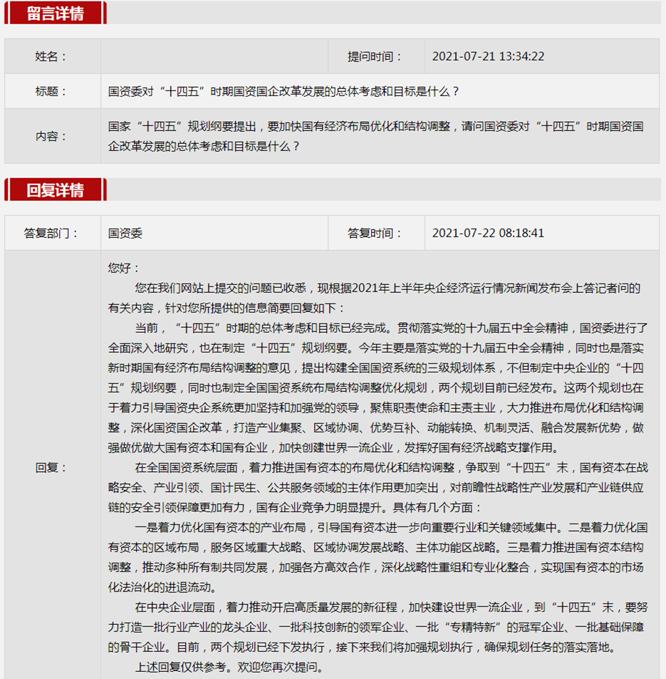 2021年7月國資委網站政務咨詢欄目部分網友提出的咨詢,我們初步做出了認真的回應,現(xiàn)選擇五條關注度高、點擊量高的問題,再次推薦分享。