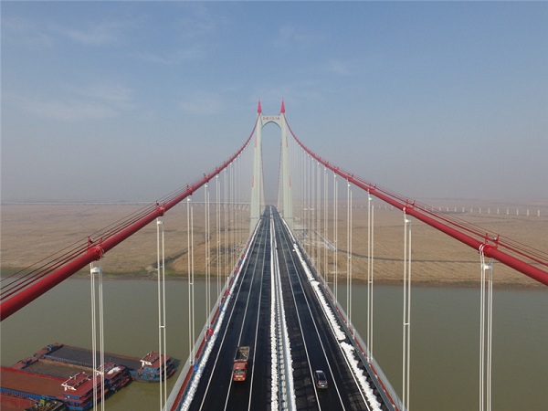 杭瑞洞庭大橋全長2390米、主跨1480米,其主跨長度在鋼桁加勁梁懸索橋中排名國內第一、世界第二。該橋實現了八項創新:首次在公路懸索橋上采用了板桁結合的超高性能混凝土輕型組合結構橋面;在國內首創新型主纜柔性纏包帶防護體系;首次采用了橋梁施工廢水環保處理技術;首次采用了1860兆帕級高強鍍鋅鋁合金鋼絲;首創葫蘆形地下連續墻新結構;首次應用了大噸位電渦流軸向阻尼器;還發明了大直徑新型鉆頭,其創新成果及建設管理經驗可供今后橋梁建設推廣應用。