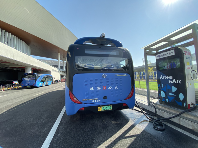 2019年12月,在珠海港珠澳大橋人工島上,一輛輛電動公交車駛入充電區域,使用能適應港珠澳三地電動汽車的充電樁進行快速充電。林丹丹 攝