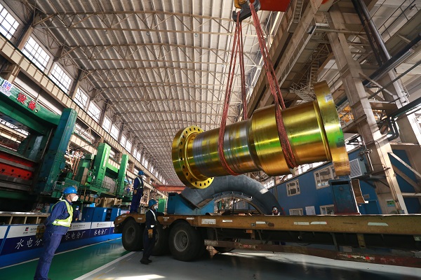 哈電集團有序復(fù)工復(fù)產(chǎn),操作者正在吊運兩河口4號機主軸。
