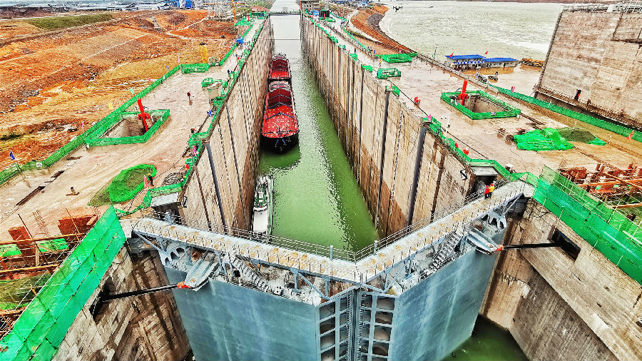 3月31日15時19分,單扇重達1295噸、堪稱“天下第一門”的大藤峽船閘水泥樞紐下閘首人字門徐徐打開,兩艘3000噸級的貨船緩緩開進船閘區。12分鐘后,船閘水位提升到44米高程,與上游庫區平齊,上閘首人字門緩緩開啟,船只順利駛入大藤峽庫區。這標志著中國能建葛洲壩集團承建的廣西大藤峽水利樞紐船閘試通航成功。