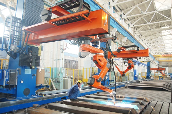 圖為中國西電集團所屬西電西變冷作車間焊接機器人按照預先編制代碼的加工指令進行油箱焊接,操作人員在檢查焊接質量。