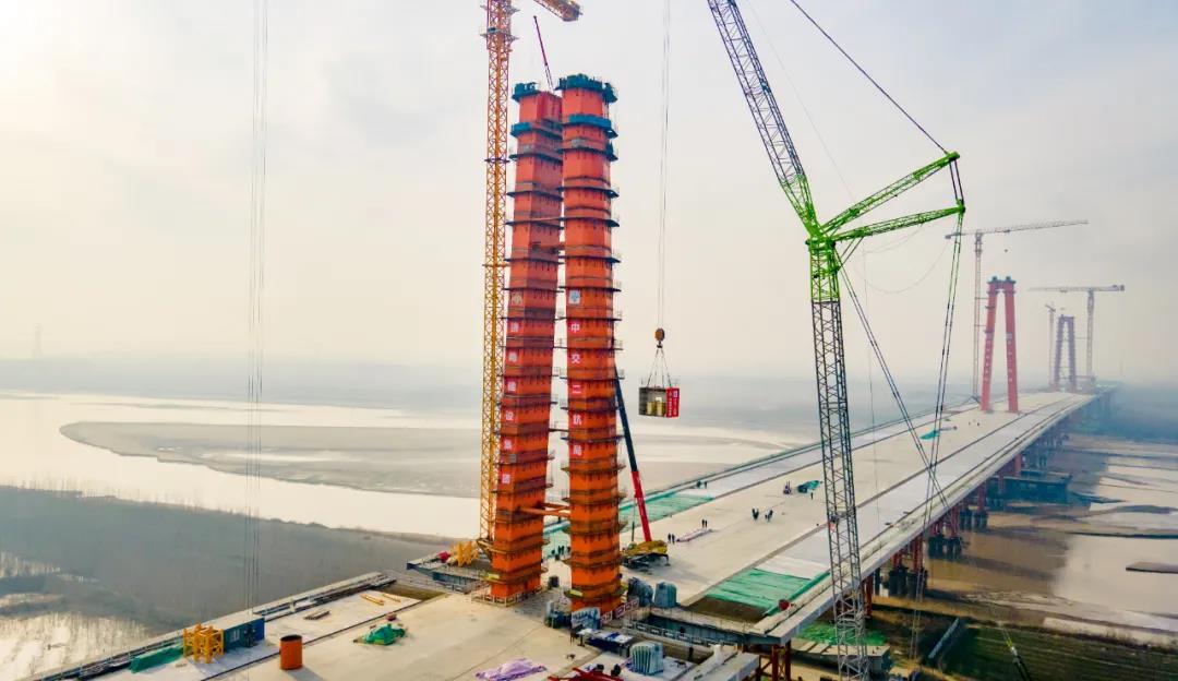 1月31日,中交集團所屬中交二航局承建的世界最大跨度三塔自錨式懸索橋——濟南鳳凰黃河大橋南北邊塔順利封頂,至此,三座主塔全部封頂。