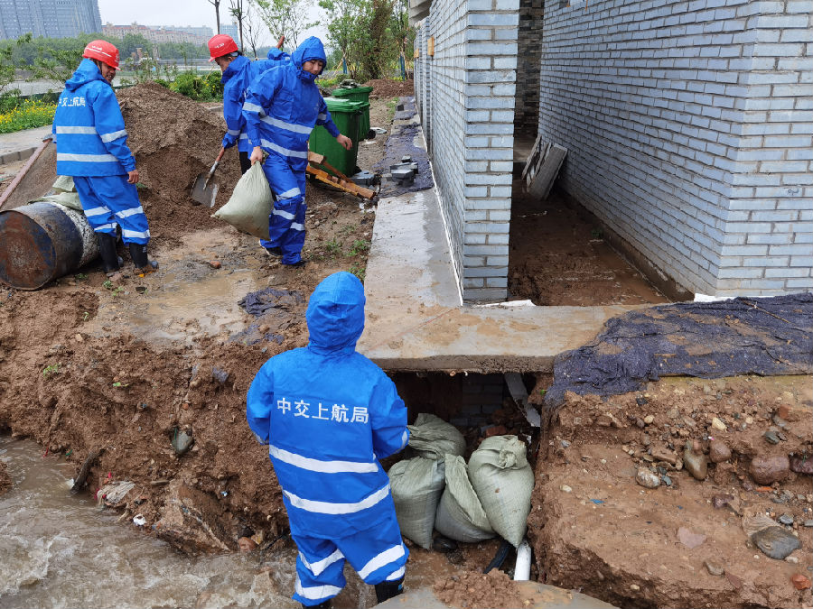 7月20日,中交上航局靈寶項目駐地附近的建業(yè)小區(qū)以北工段排水系統(tǒng)超負荷運轉(zhuǎn),出現(xiàn)雨水倒灌現(xiàn)象,危及項目已建成區(qū)域和附近居民安全。項目部啟動防汛應急預案并立即開展搶險工作,開挖排水溝進行導流,對沖榻部位裝填沙袋,保障工地建成區(qū)及小區(qū)居民的安全。