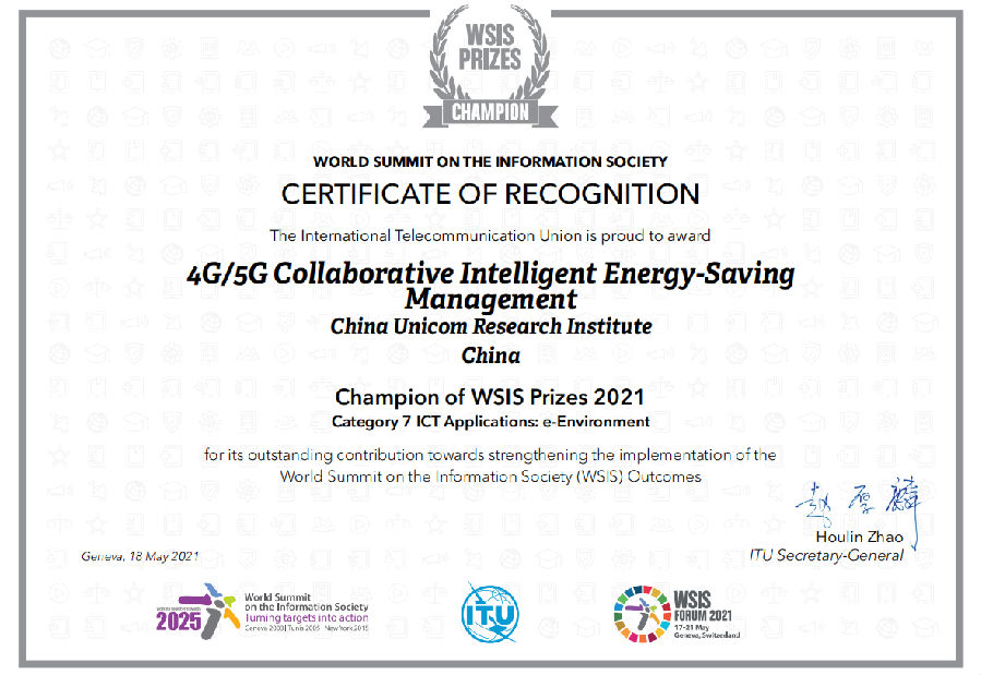 與此同時,中國聯通運用綠色環保理念打造了“4G/5G協同智能節能管理平臺”,突破了傳統節能方案中管理難度高、節能效果欠佳的瓶頸,實現多制式網絡智能協同、“一站一策”差異化節能調度,推動通信網絡向綠色、高效、智能化可持續發展。該平臺可實現八大部署場景、六種節能方案、精準共覆蓋判斷、六大業務指標監測等功能,經省分試點,基站可節約電費10%以上。2021年5月,中國聯通研究院“4G/5G協同智能節能管理”項目榮獲國際電聯信息社會世界峰會WSIS ICT電子環境組冠軍獎,是今年電子環境保護領域唯一獲此殊榮的中國企業。