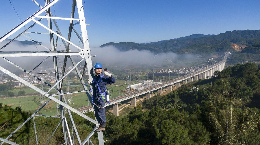 中老鐵路開通前,南方電網云南普洱供電局輸電管理所組織工作人員對供電線路與鐵路交叉跨越點設備進行巡視。圖為工作人員正在對佛臺山牽引變II回81號塔及線路通道進行察看。