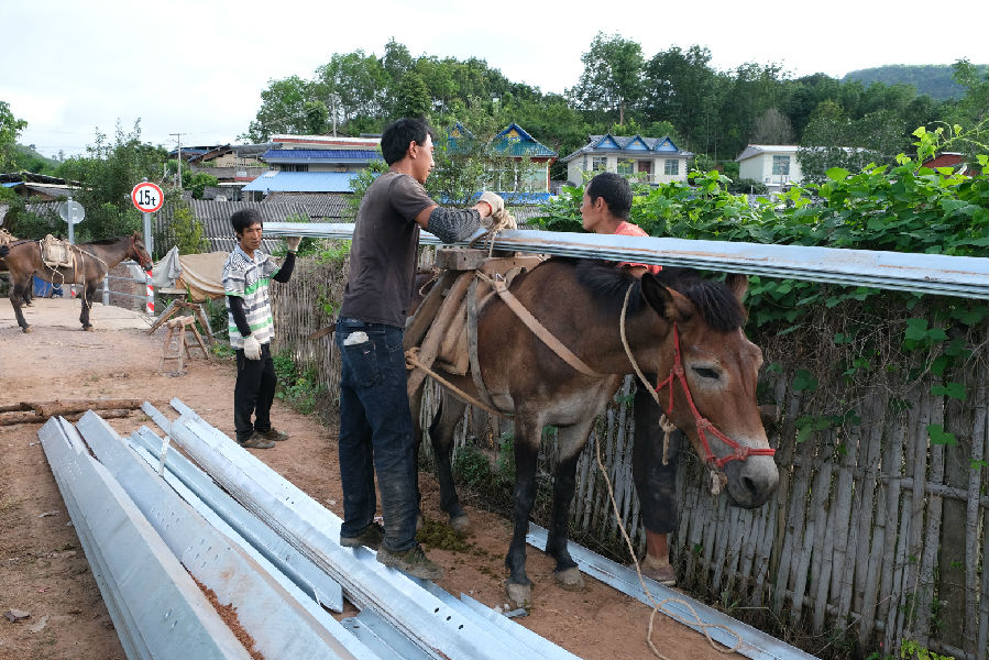 為了保護當地生態環境,許多山林地區盡量不修建專門的施工便道,這也意味著塔材需要采取原始的肩挑馬馱來運輸。圖為中老鐵路云南西雙版納段施工現場用馬幫運送塔材。