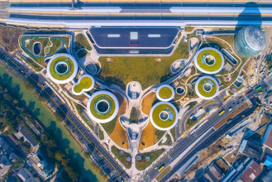 嘉興火車站是集綠色、人文、歷史要素為一體的交通商務綜合體。北廣場將人民公園延伸覆蓋至站前廣場,密植超過1500棵樹木,并保留改造宣公弄區域,打造新時代重走“一大路”場景。南廣場的商業空間與綠地環繞交錯,7個取自嘉興市傳統馬家浜文化的玉玨裙樓漂浮之上,形成靈動別致的城市公共空間。同時,嘉興火車站將原地面廣場混流交織的交通樞紐分散在南北廣場地下各處,也將候車大廳、售票廳等主要交通和商業功能收置于地下區域,成為全國首個下沉式火車站。