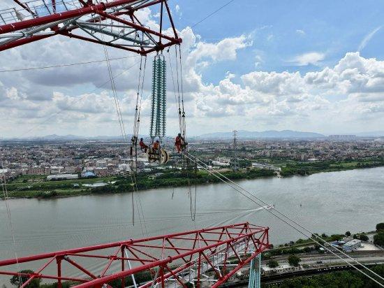 南方電網廣東江門臺山供電局工作人員頭頂烈日,在高空中對10千伏皇宮線永豐支線進行針式絕緣子更換及加裝避雷器