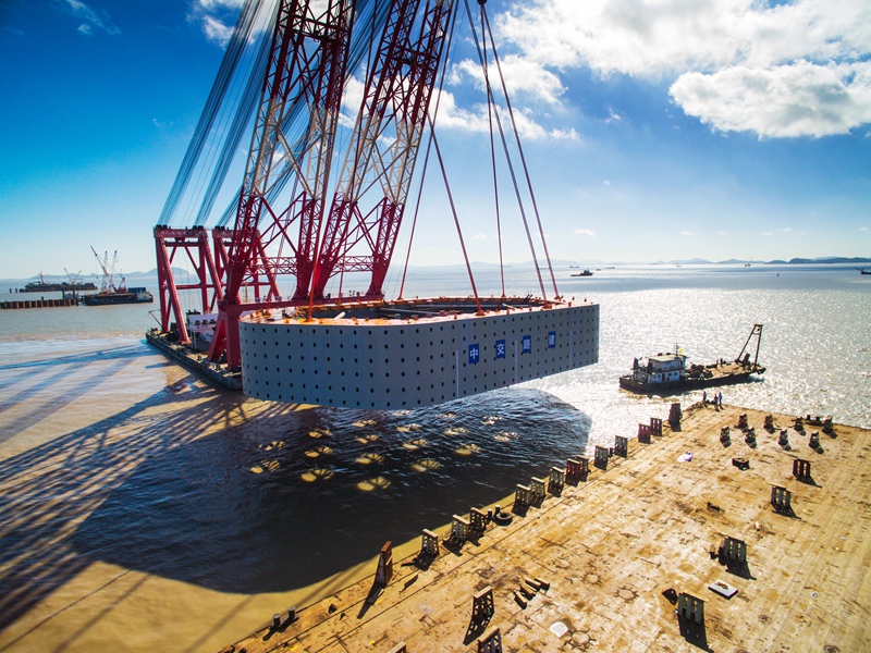 7月14日,中國交建所屬中交路建承建的浙江舟岱跨海大橋首個10萬噸級防撞鋼套箱整體安裝圓滿完成,標志著大橋主墩承臺施工拉開序幕。