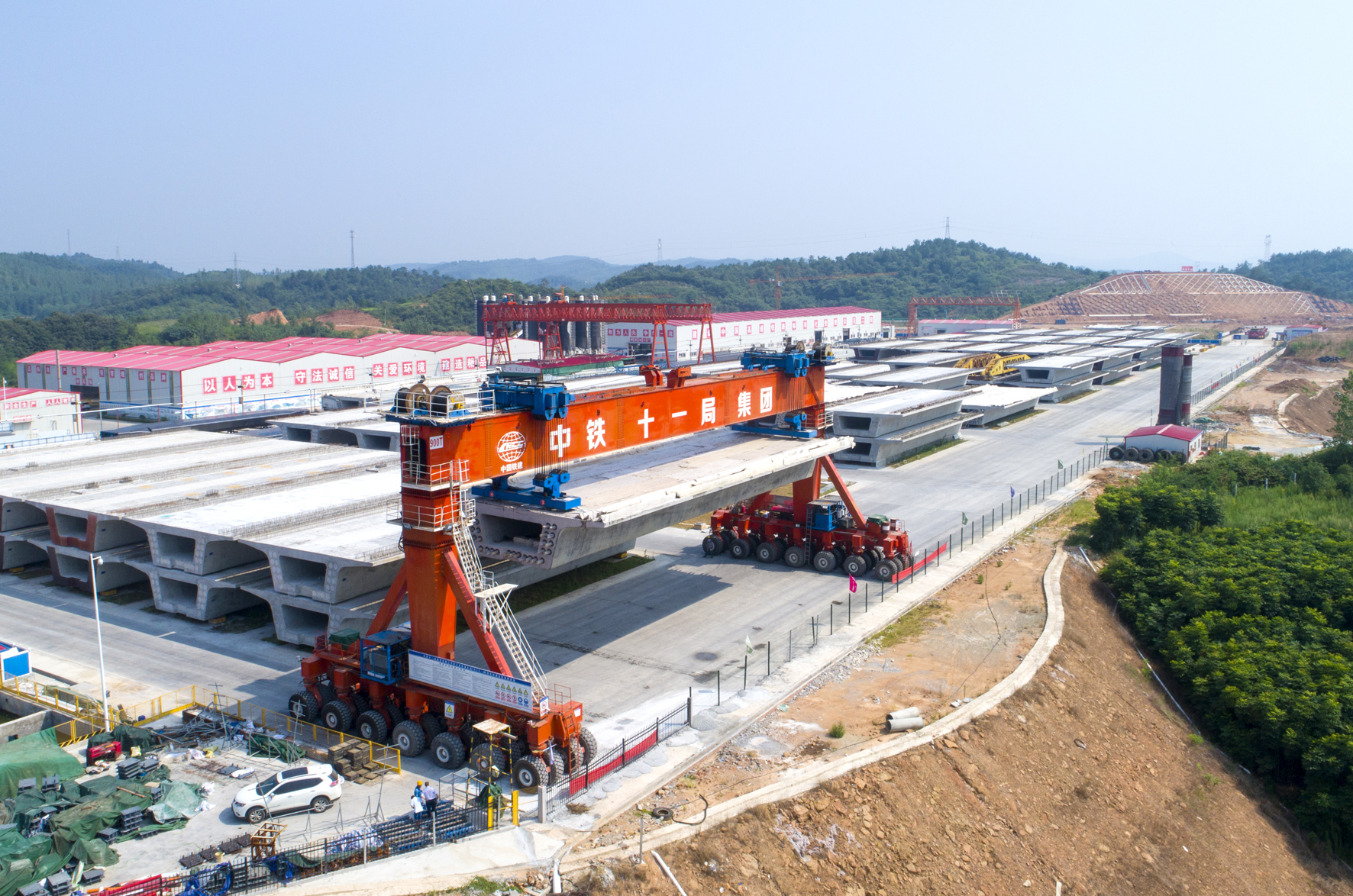 當日上午9點16分,中國鐵建所屬中鐵十一局承建的鄭萬高鐵湖北段ZWZQ-5標首榀箱梁架設儀式在襄陽市南漳縣郝家灣雙線特大橋架梁現(xiàn)場隆重舉行。由中鐵十一局漢江重工自行研制的新型900噸級梁架橋機,在施工人員操控下,將一榀長24米、寬12.6米、高3.035米、重600噸的箱梁平穩(wěn)精準安放在橋墩上,至此,標志鄭萬高鐵最難施工段已達到架梁標準,架梁施工步入正軌。