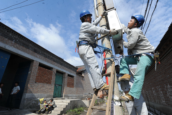 北京昌平供電公司員工在十三陵鎮康陵村進行“煤改電”施工