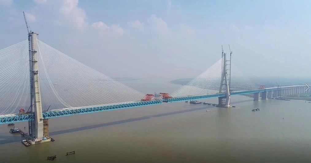 五峰山長江大橋自2015年10月開工建設(shè),以江蘇省鐵路集團(tuán)為主投資,由國鐵上海局集團(tuán)建設(shè)管理、中鐵大橋院設(shè)計、鐵科院大橋院聯(lián)合體監(jiān)理、中鐵大橋局施工,全長6409米,主跨1092米,上層為雙向八車道高速公路,設(shè)計時速為100公里。下層為四線高速鐵路,設(shè)計時速為250公里。該橋是我國首座公鐵兩用懸索橋,也是世界上運(yùn)行速度最快、運(yùn)行荷載最大、跨度最大的公鐵兩用懸索橋,是我國建橋史上又一座豐碑。