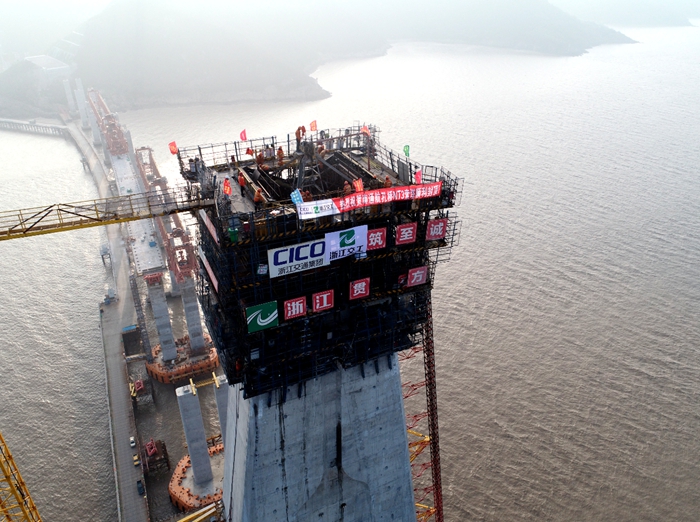 南通航孔橋是海上大跨徑特大斜拉橋,塔柱橋址區位于浙江東北部沿海海域,常年經受臺風、季風、潮水等影響,極大地增加了施工難度。自施工以來,全體參建者充分發揚“不怕吃苦,就怕沒苦吃”的拼搏精神,以黨員先鋒為引領主導,組織攻堅克難小組嚴把質量關,高度重視精細化管理和規范性施工,采用24小時輪班制,以技術管理,材料供應及人員、機械配置為保障,為主塔封頂保駕護航。