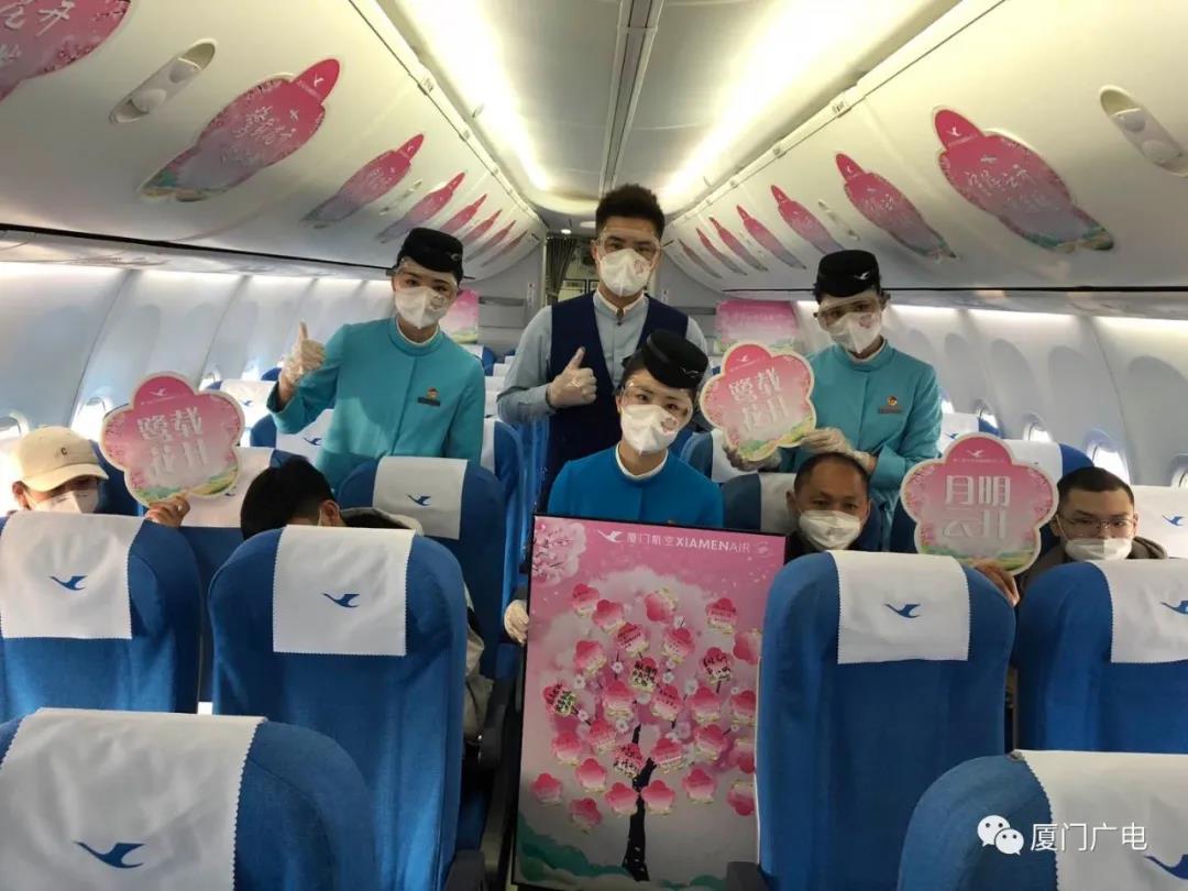 接到復航計劃后,廈航特別選派精英機組、乘務組執行航班任務,并在MF8095杭州-武漢、MF8338武漢-廈門航班上特別準備了溫馨的主題活動,邀請旅客一同飛往春天。每位機組成員都特別在口罩上貼上櫻花貼紙,為“久別重逢”的武漢旅客送上溫暖的問候。客艙中,目之所及處盡是櫻花主題貼紙,每位旅客收到了一份復工復產《健康手冊》以及櫻花紀念書簽。